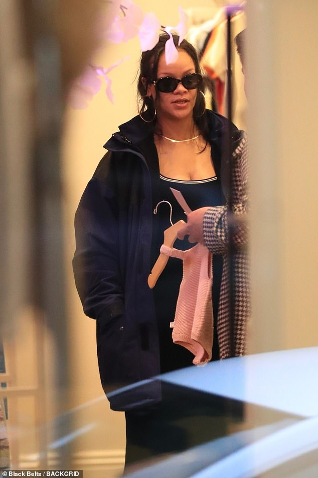 The songstress, 35, who is already mom to a son, 11 months, with beau A$AP Rocky, 34, was seen checking out a pastel pink knitted romper, indicating she will soon welcome a baby girl.